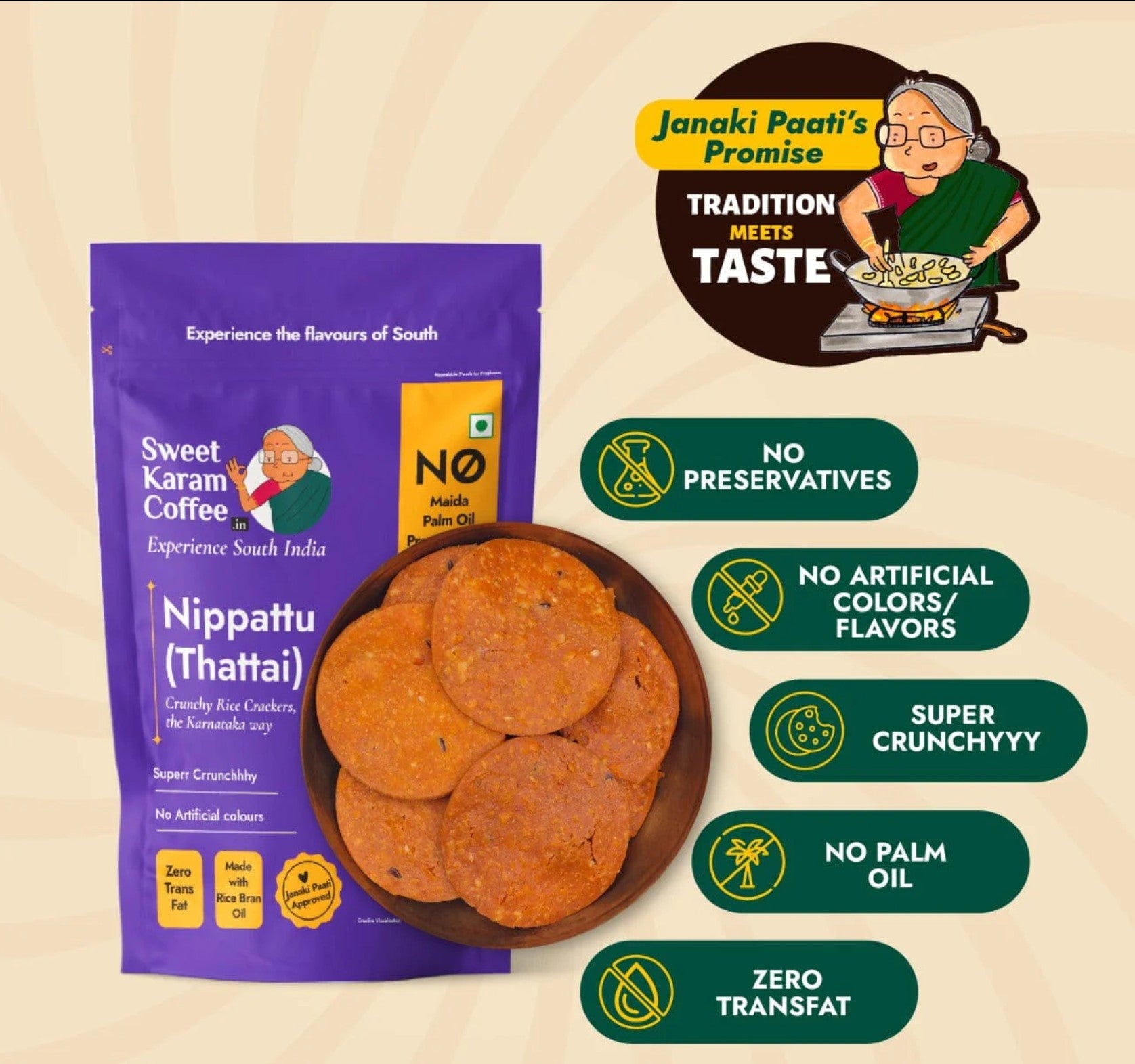 Hailing from Karnataka, these savoury rice crackers are the heart and soul of snacking. Share a packet of traditional goodies, hear the delicious crackle of traditionally made nippattu.