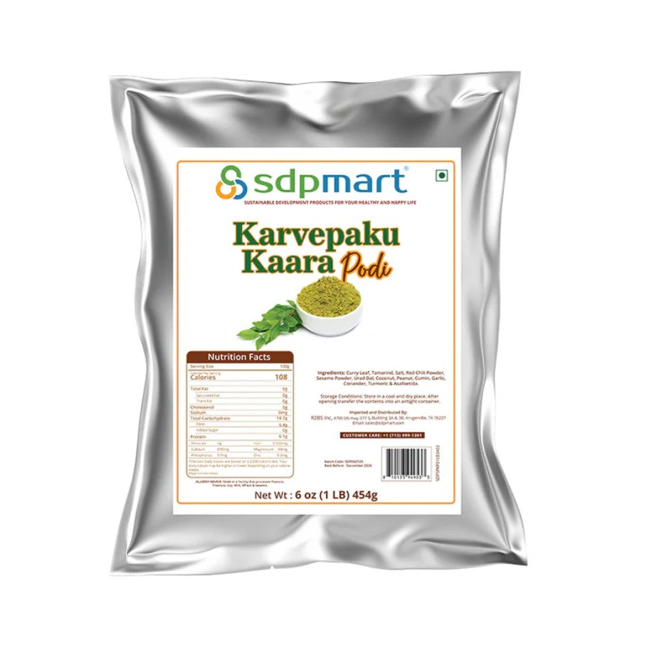 SDPMart Andhra Karvepaku Kara Podi is a true homemade Andhra specialty, bringing the rich, traditional flavors of our hometown kitchens to your table. Prepared using handpicked curry leaves, roasted lentils, red chilies, garlic, and a blend of authentic Andhra spices, this aromatic powder captures the essence of age-old home recipes passed down through generations. Each batch is slow-roasted and ground in small quantities to preserve freshness, flavor, and the natural goodness of the ingredients. Perfect with hot rice and ghee, idli, dosa, or curries, SDPMart Andhra Karvepaku Kara Podi delivers the unmistakable homemade taste and spicy-savoury depth that define authentic Andhra cuisine — pure, flavorful, and traditionally crafted.